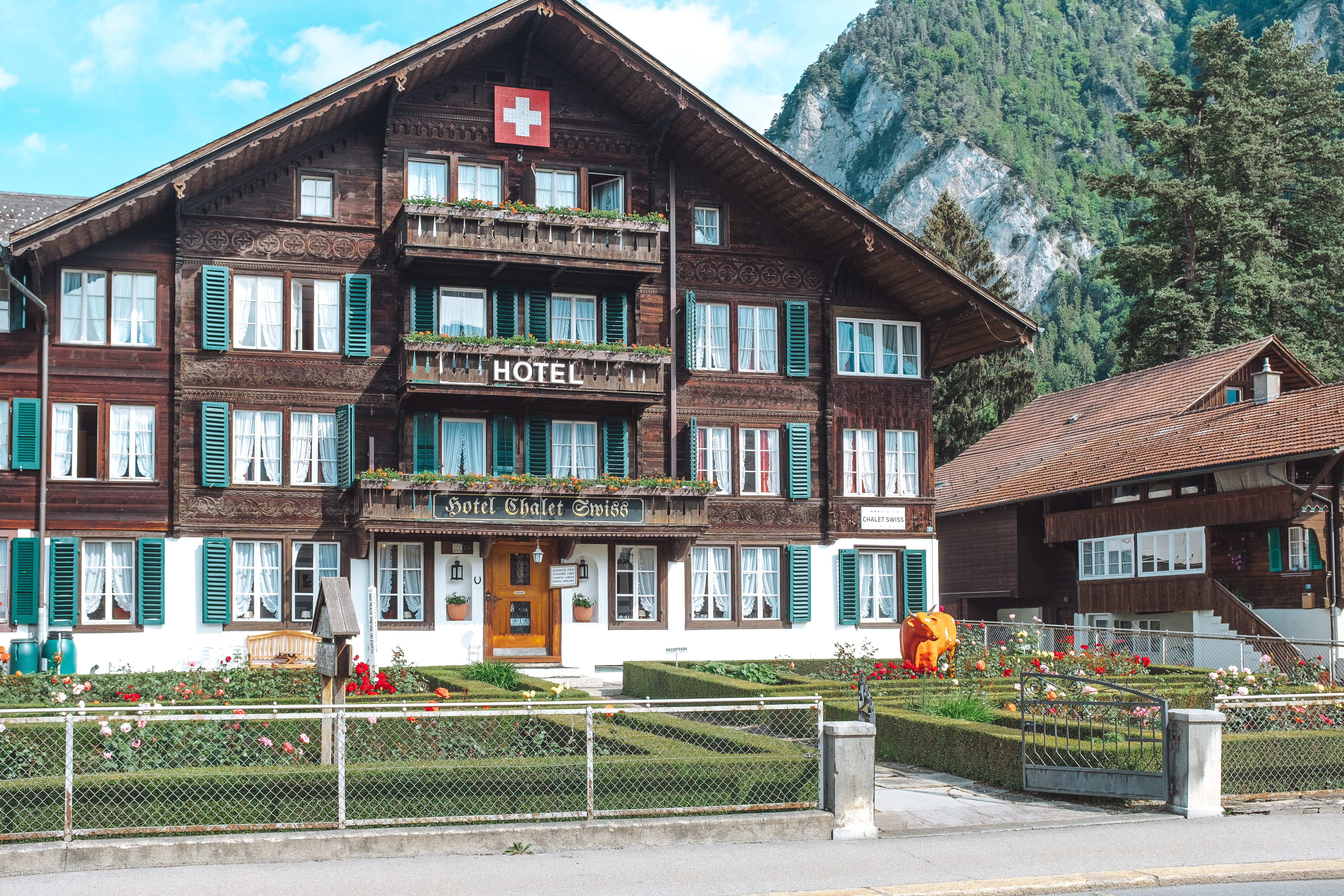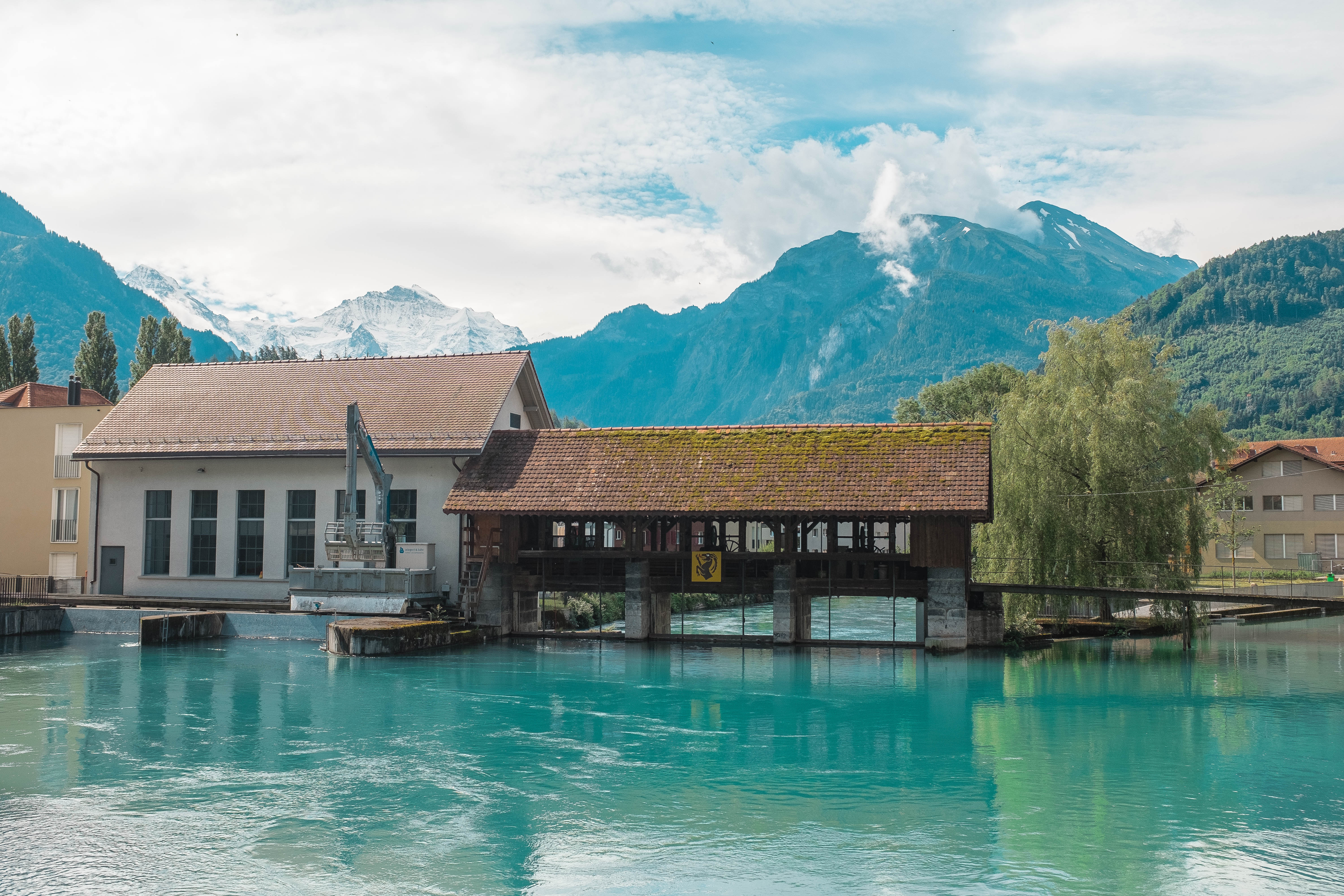 Interlaken is a traditional resort town in the mountainous Bernese Oberland region of central Switzerland. Built on a narrow stretch of valley, between the emerald-colored waters of Lake Thun and Lake Brienz, it has old timber houses and parkland on either side of the Aare River. Its surrounding mountains, with dense forests, alpine meadows and glaciers, has numerous hiking and skiing trails.