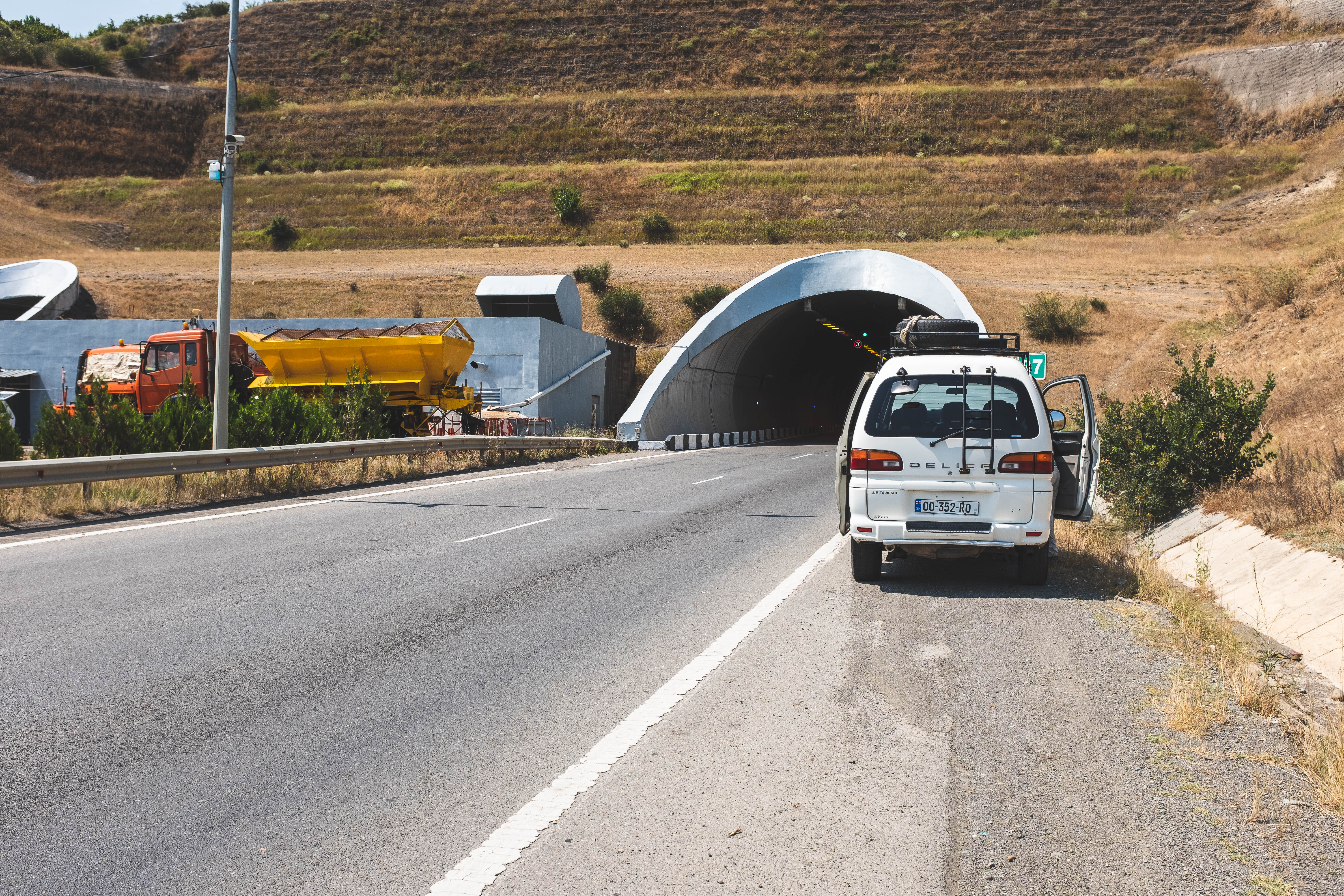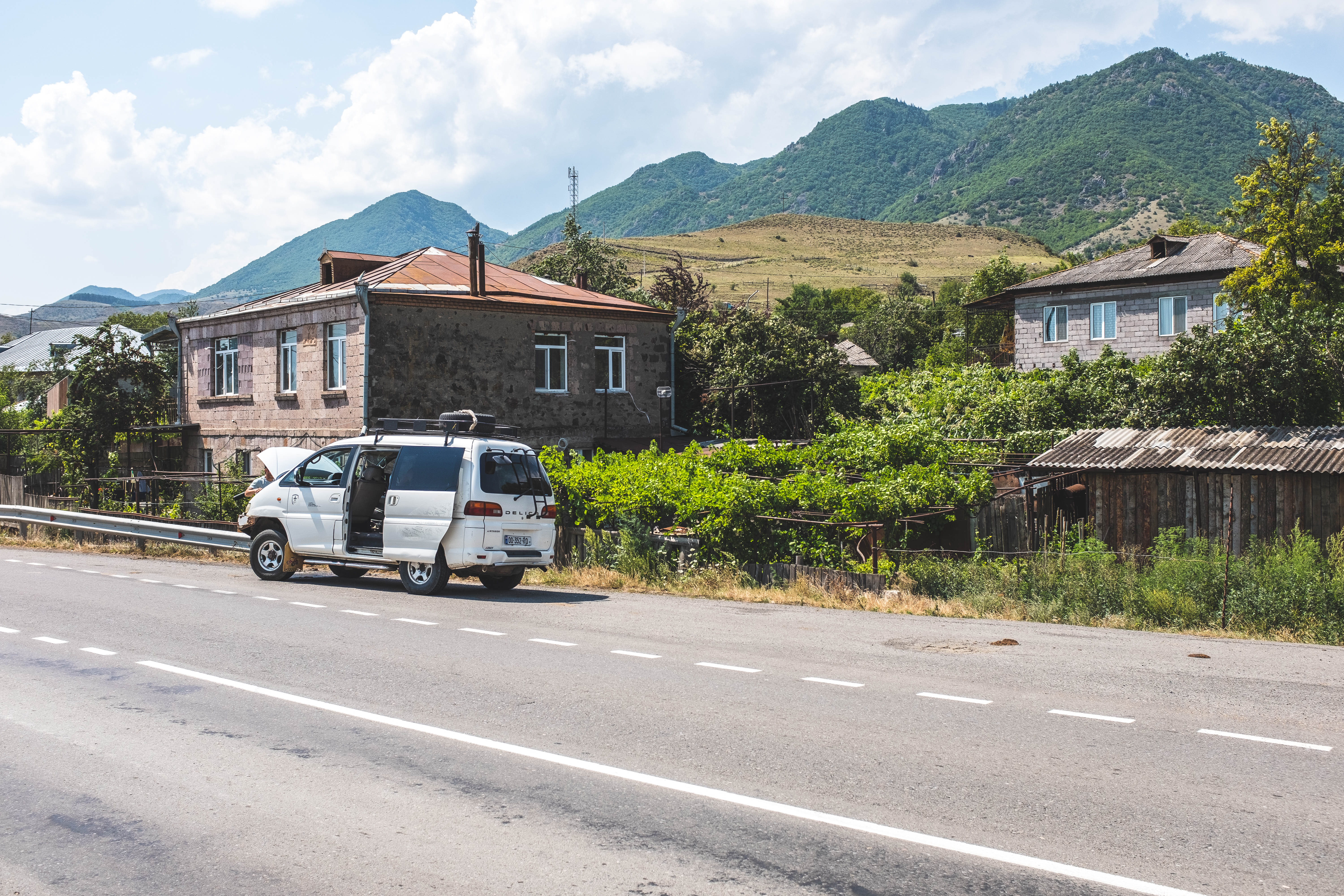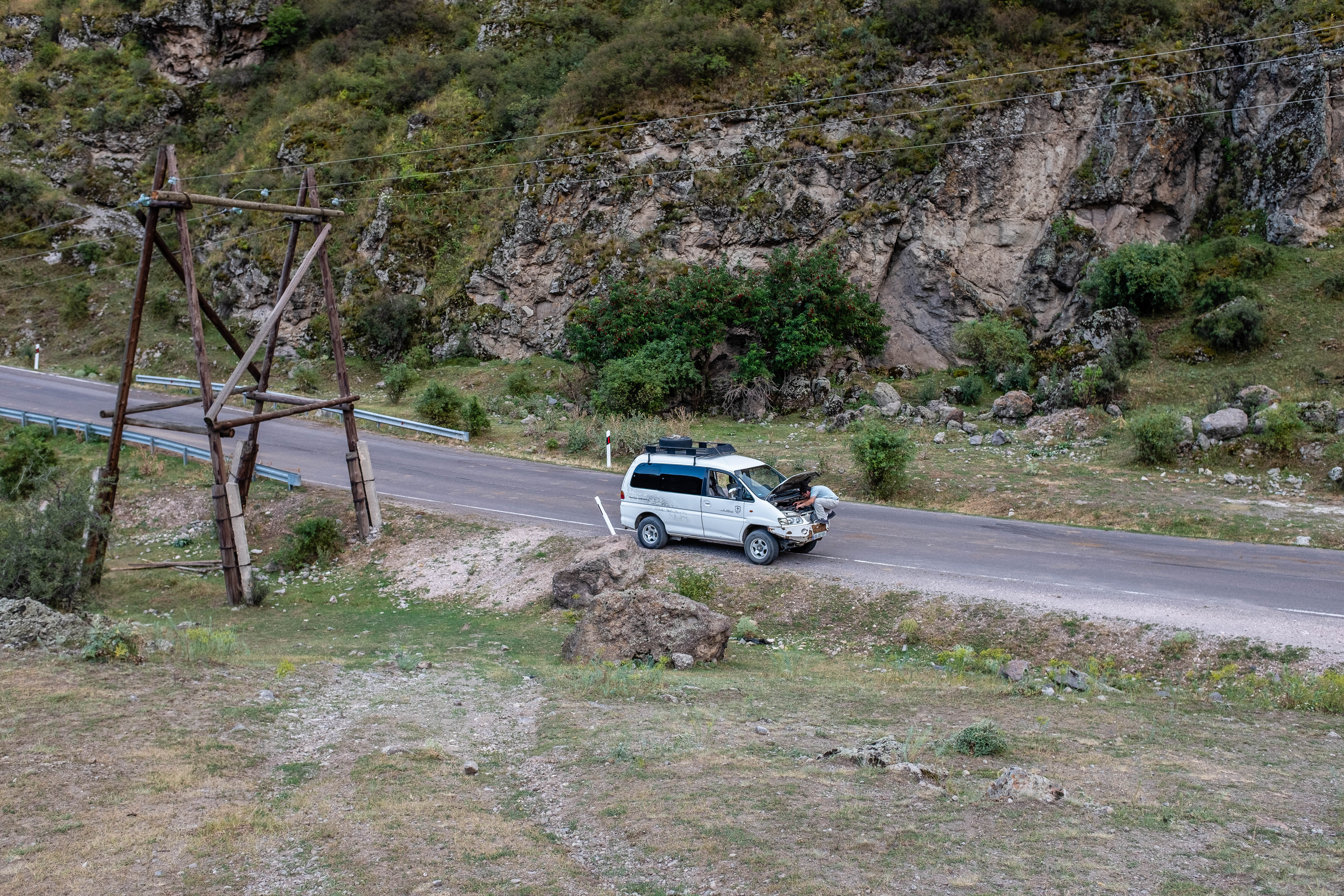 After Chiatura, Laika and I wanted to stop for dinner, so Levan promised a break after we made it out of the valley. However, due to prolonged ascending up the valley, the van overheated, so we pulled over next to a field to allow the engine to cool.